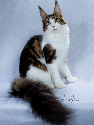 We are thrilled to welcome Sierra into our cattery as a future Queen! We praise God for our partnership with Liz Brown of Chemicoons and for her mentorship into breeding Maine Coons and showing with TICA. We wouldn't & couldn't do it without Liz! Sierra is a spunky, brown classic torbie with white. She has such a unique coat color and has ultra soft, fluffy fur.